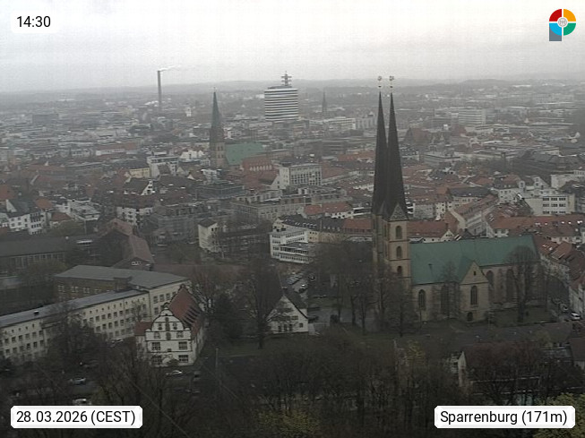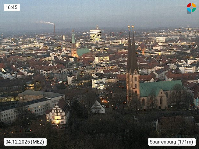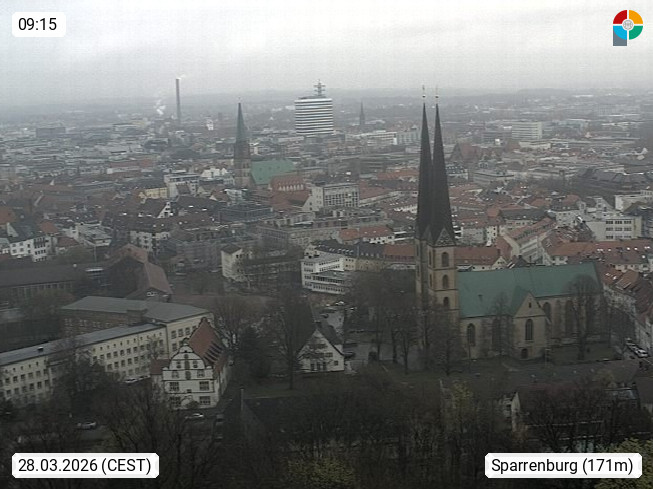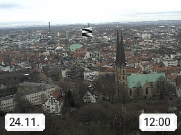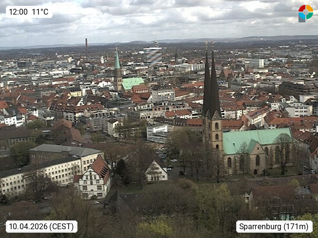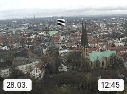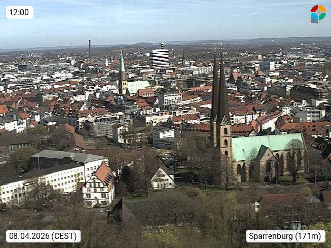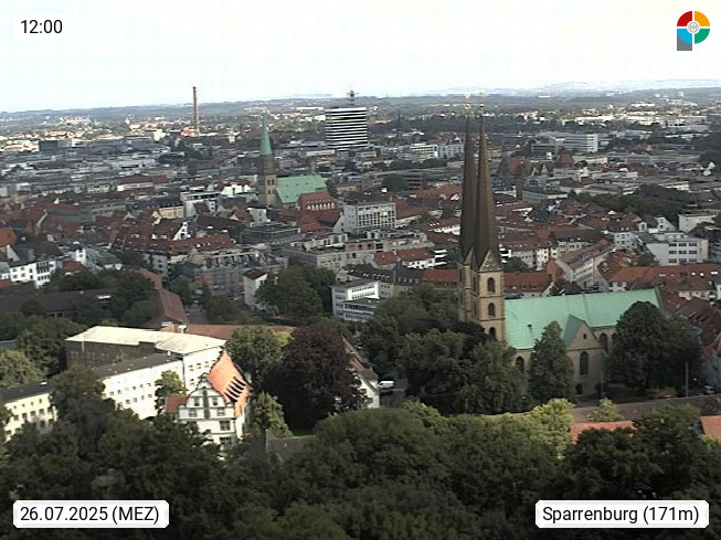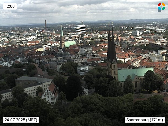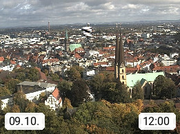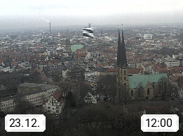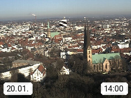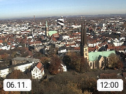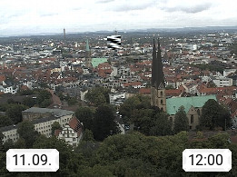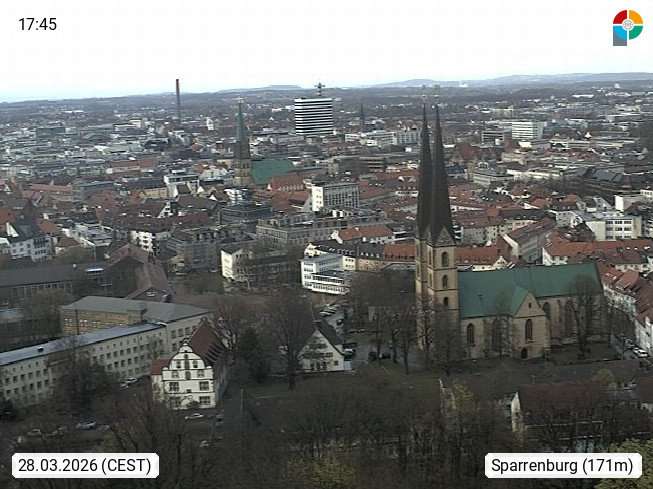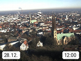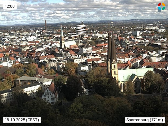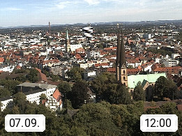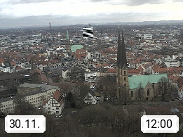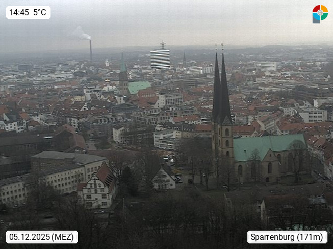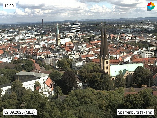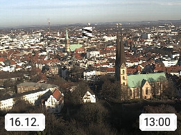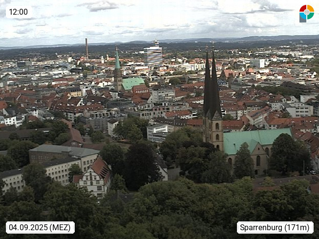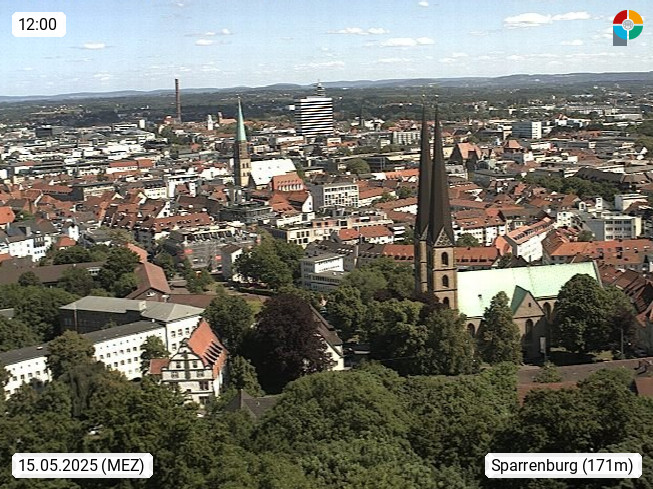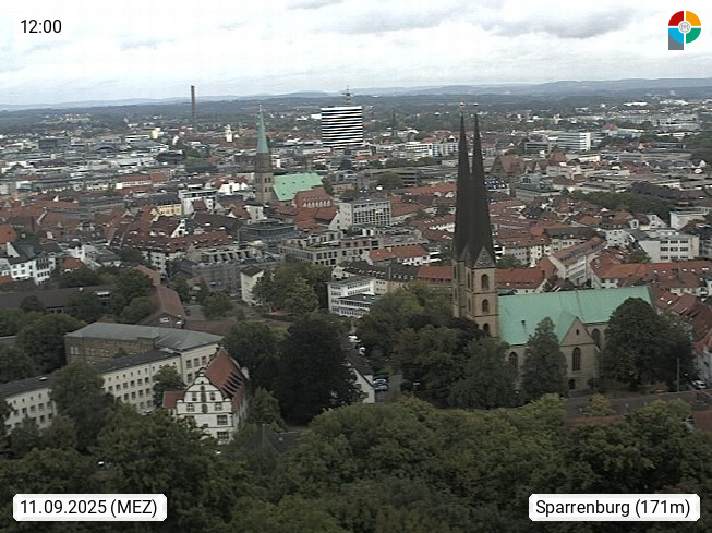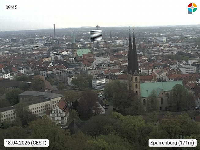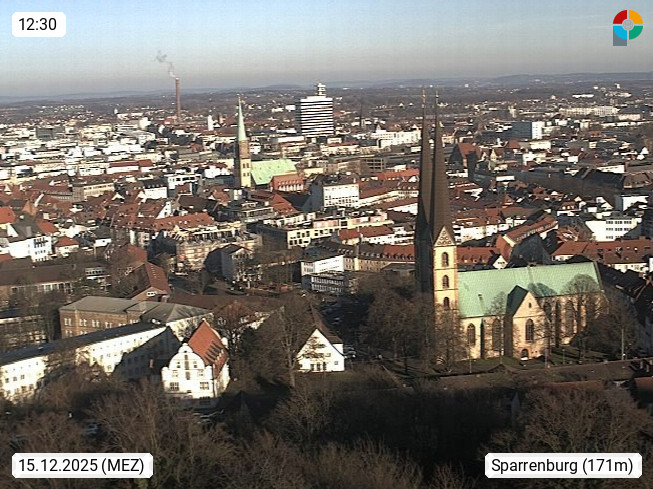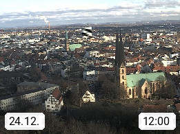 D 33609 Bielfeld Sparrenburg 182m, kreisfreie Stadt im Regierungsbezirk Detmold im Nordosten Nordrhein Westfalens in der Hügellandschaft der Ravensberger Mulde. Panoramablick von der Sparrenburg einer restaurierten Festungsanlage und Wahrzeichen von Bielefeld, Richtung Norden. Präsentiert von https://bicos.de/.
