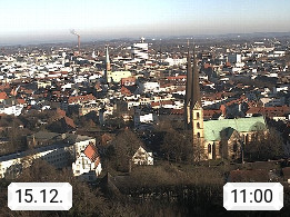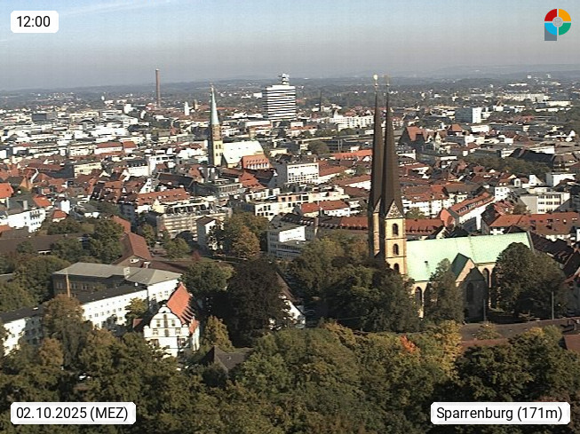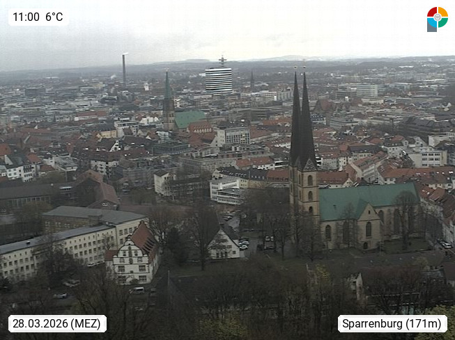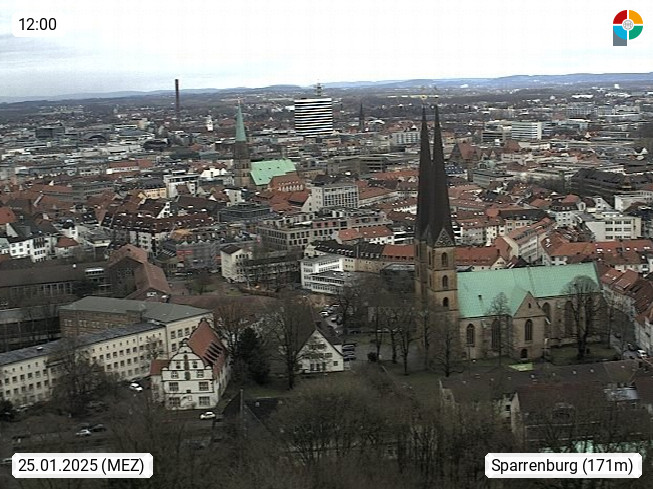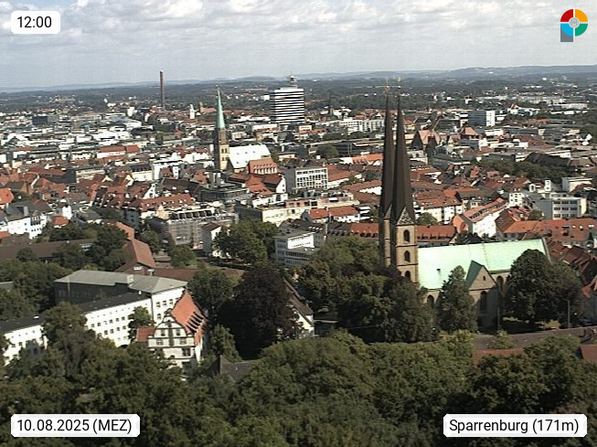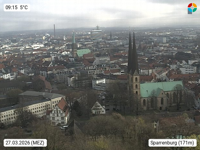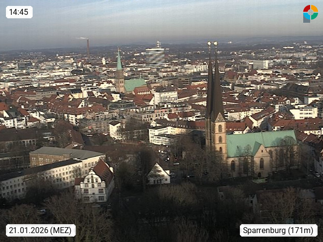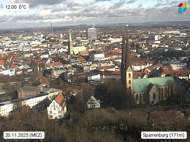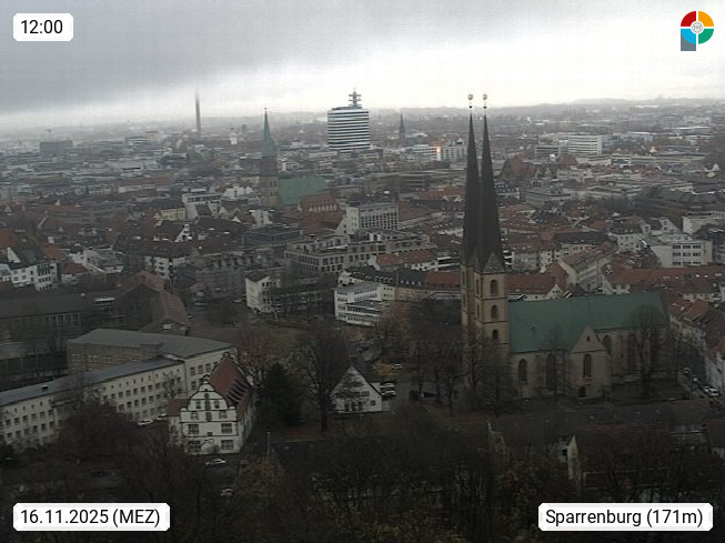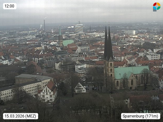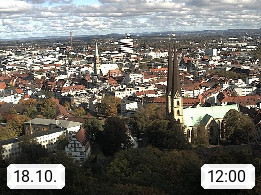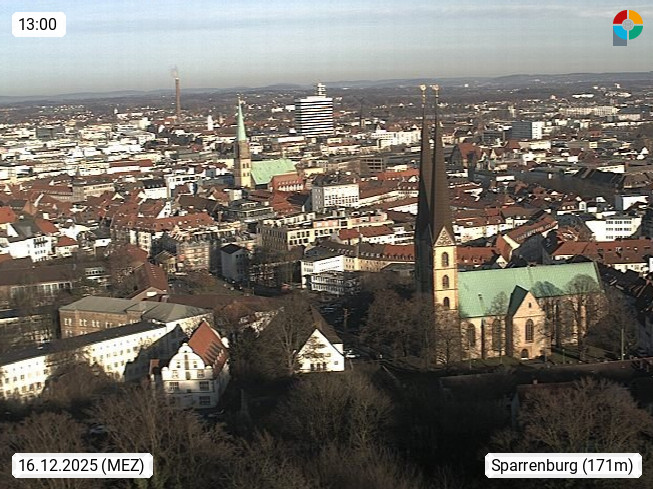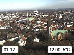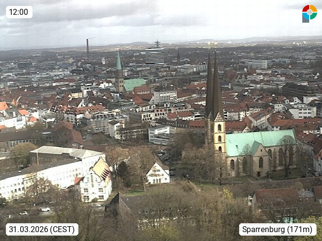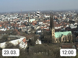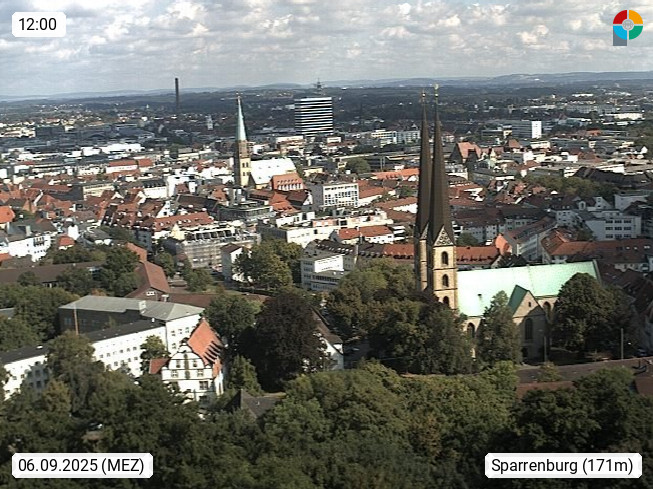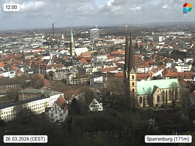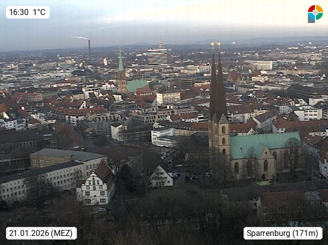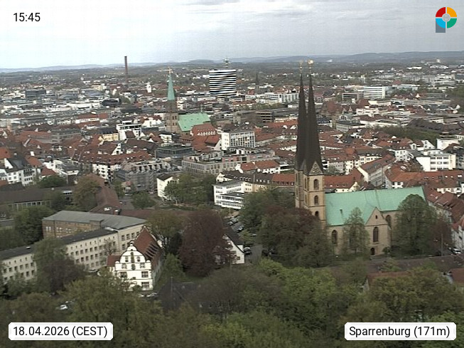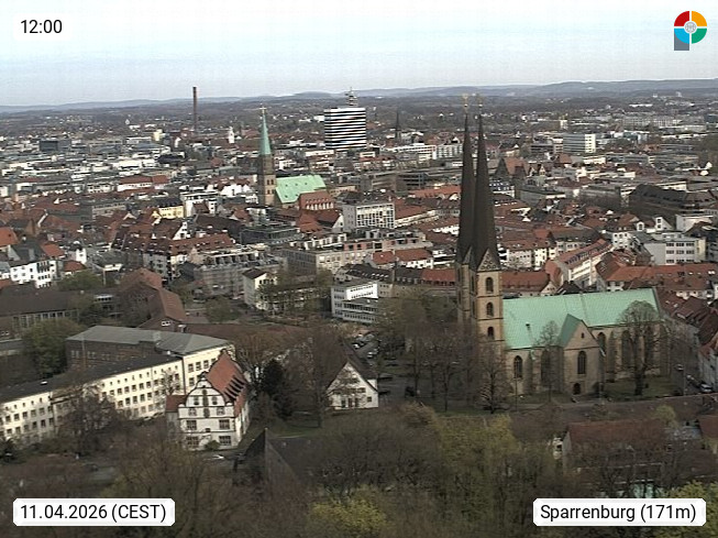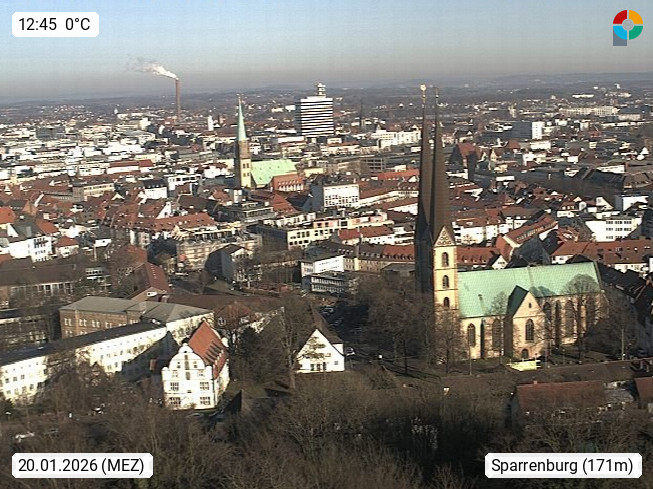 D 33609 Bielfeld Sparrenburg 182m, kreisfreie Stadt im Regierungsbezirk Detmold im Nordosten Nordrhein Westfalens in der Hügellandschaft der Ravensberger Mulde. Panoramablick von der Sparrenburg einer restaurierten Festungsanlage und Wahrzeichen von Bielefeld, Richtung Norden. Präsentiert von https://bicos.de/.