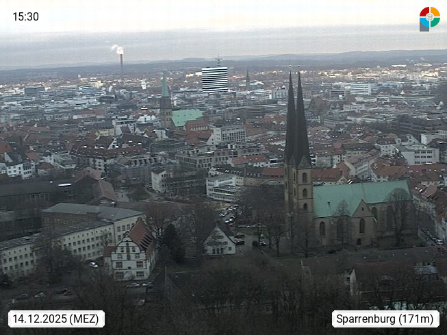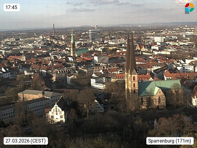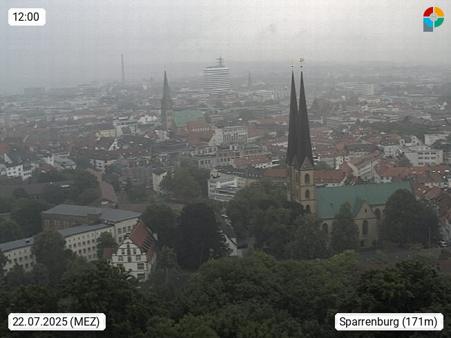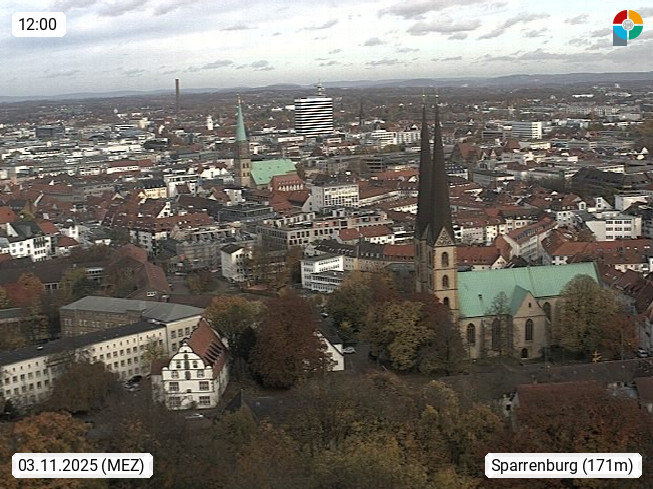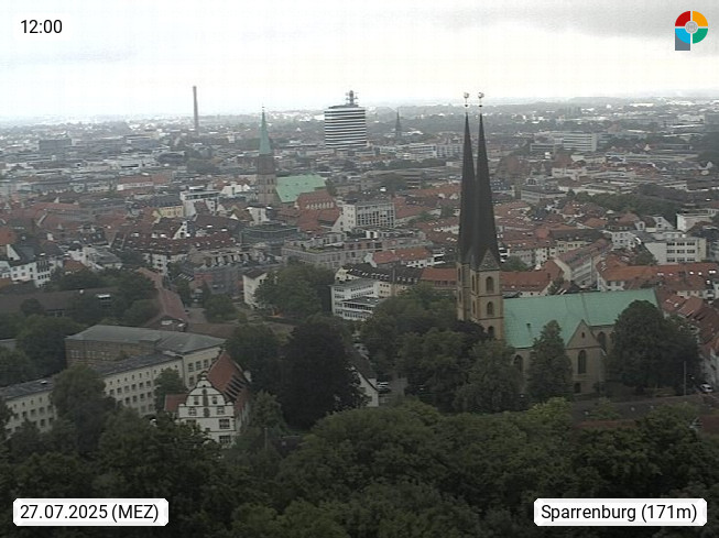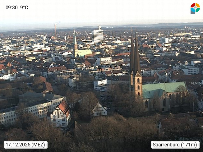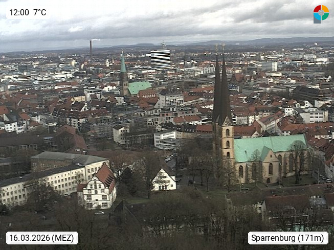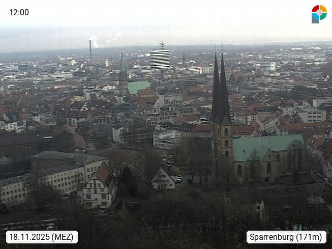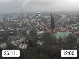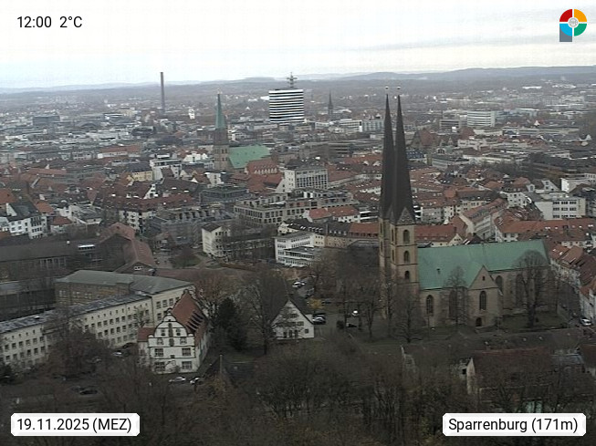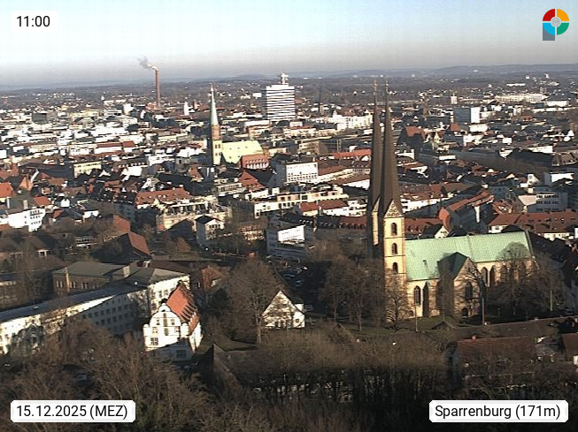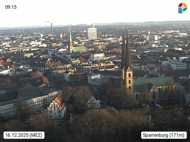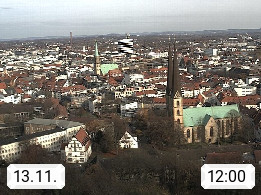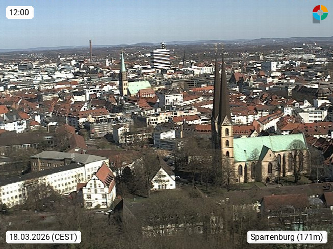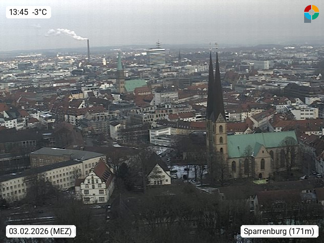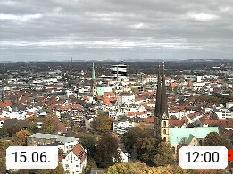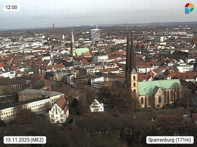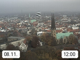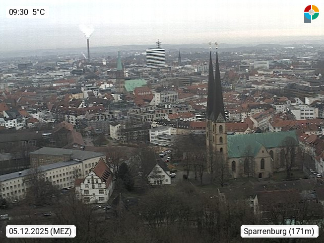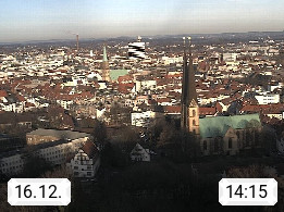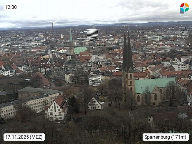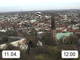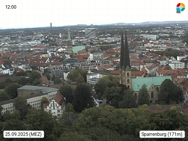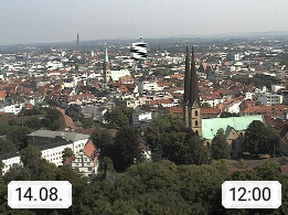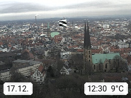 D 33609 Bielfeld Sparrenburg 182m, kreisfreie Stadt im Regierungsbezirk Detmold im Nordosten Nordrhein Westfalens in der Hügellandschaft der Ravensberger Mulde. Panoramablick von der Sparrenburg einer restaurierten Festungsanlage und Wahrzeichen von Bielefeld, Richtung Norden. Präsentiert von https://bicos.de/.