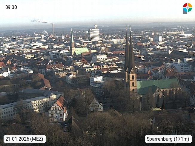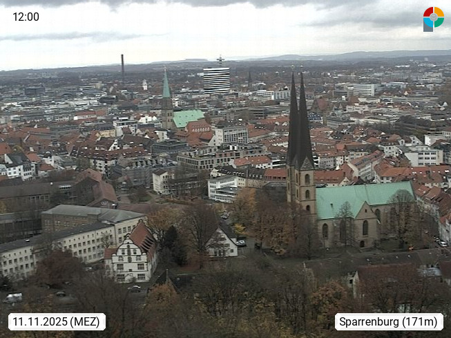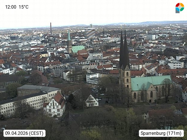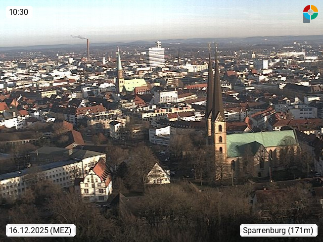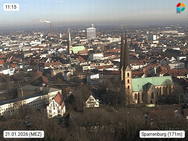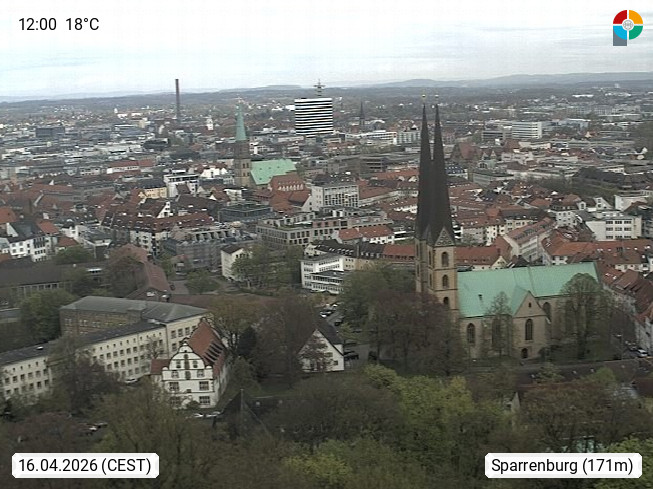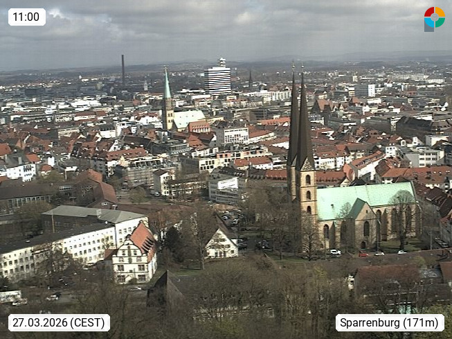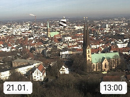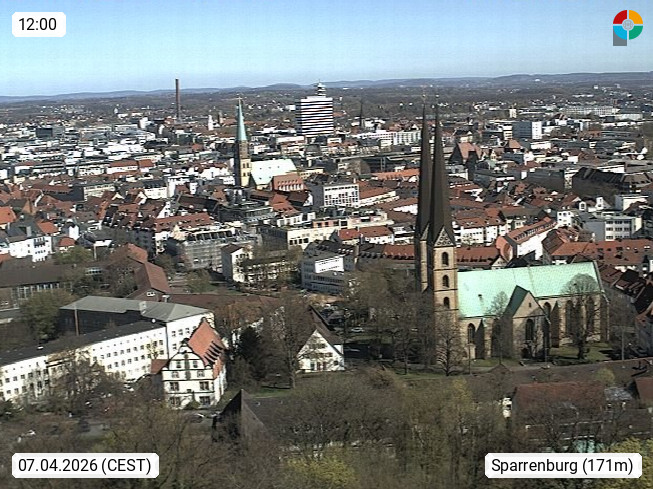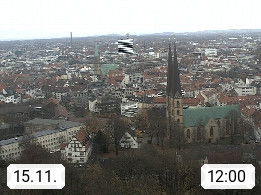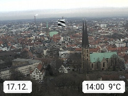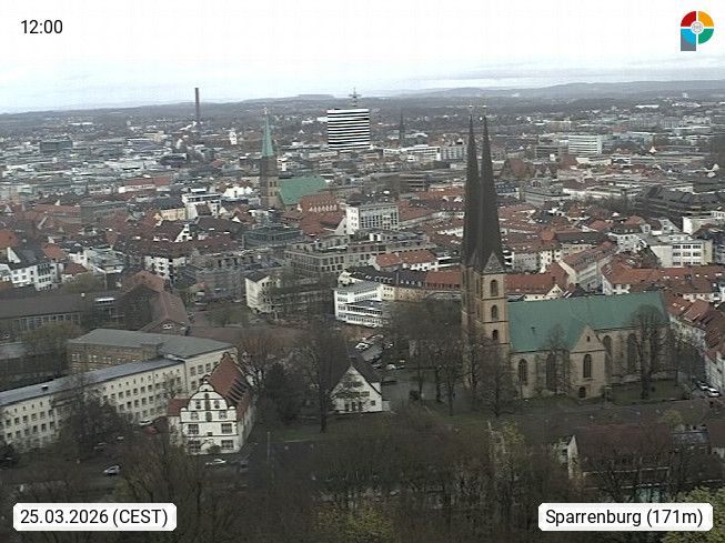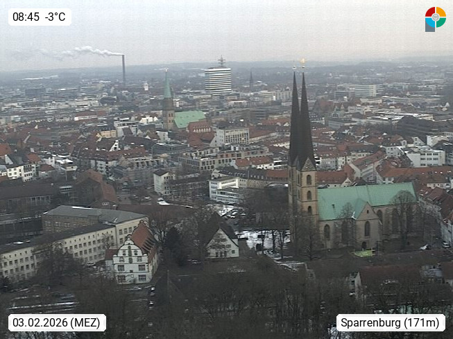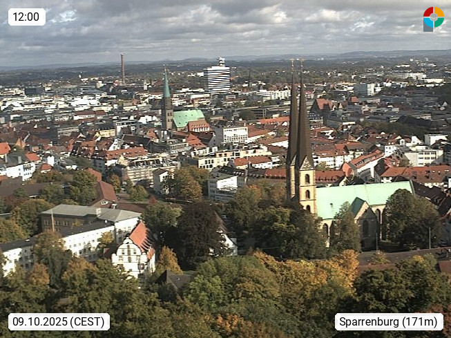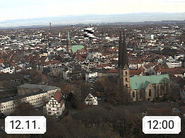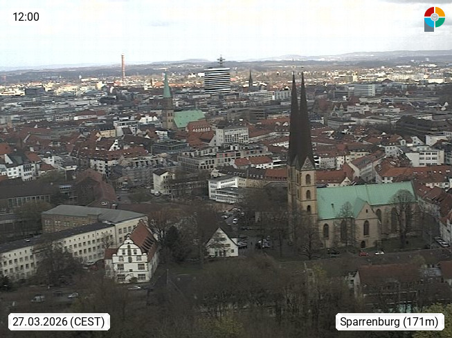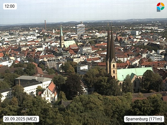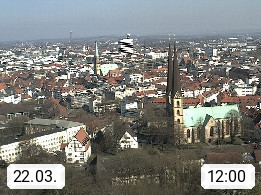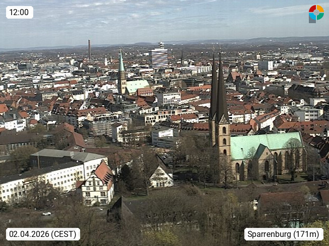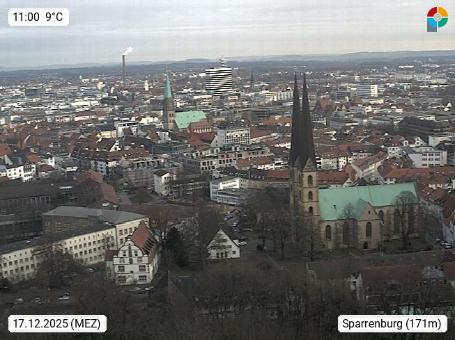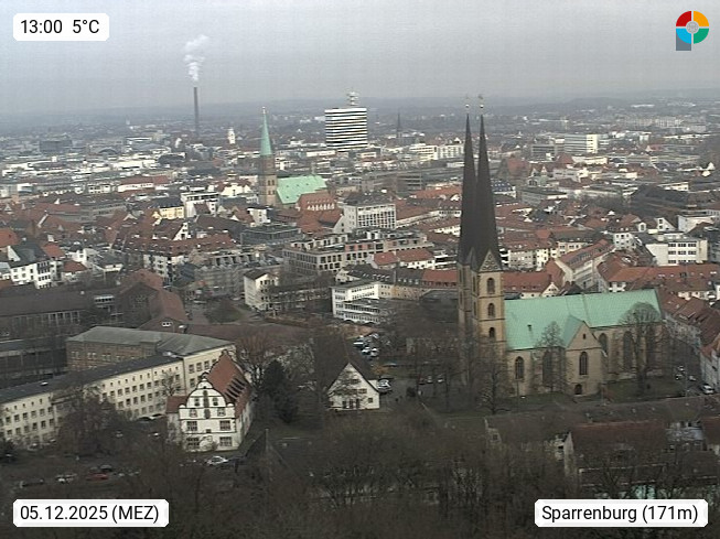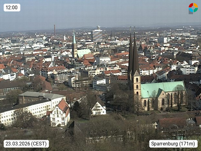 D 33609 Bielfeld Sparrenburg 182m, kreisfreie Stadt im Regierungsbezirk Detmold im Nordosten Nordrhein Westfalens in der Hügellandschaft der Ravensberger Mulde. Panoramablick von der Sparrenburg einer restaurierten Festungsanlage und Wahrzeichen von Bielefeld, Richtung Norden. Präsentiert von https://bicos.de/.