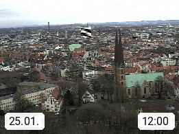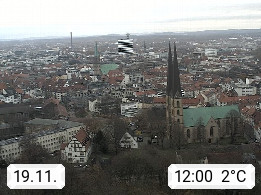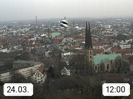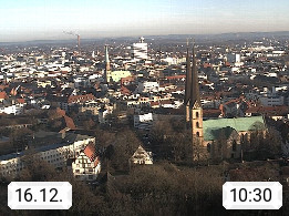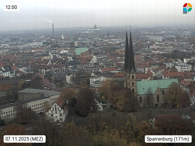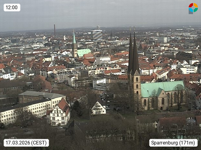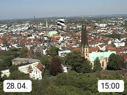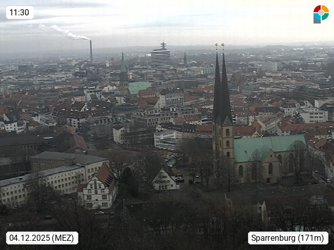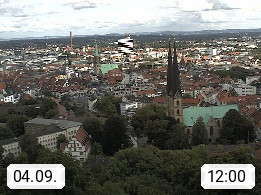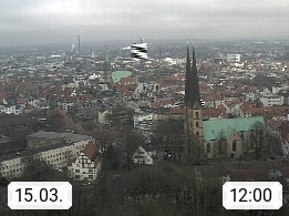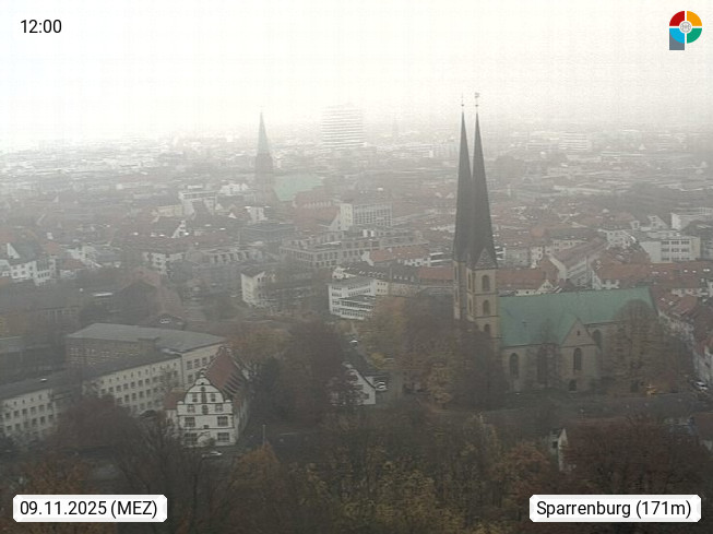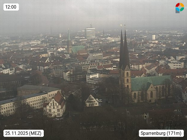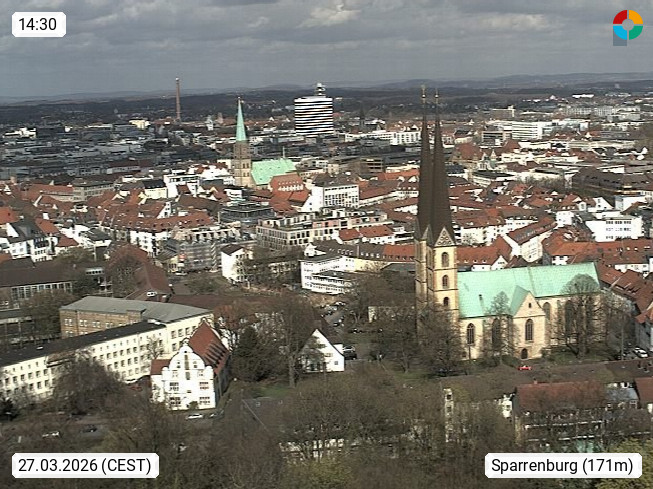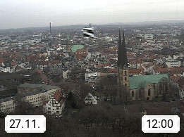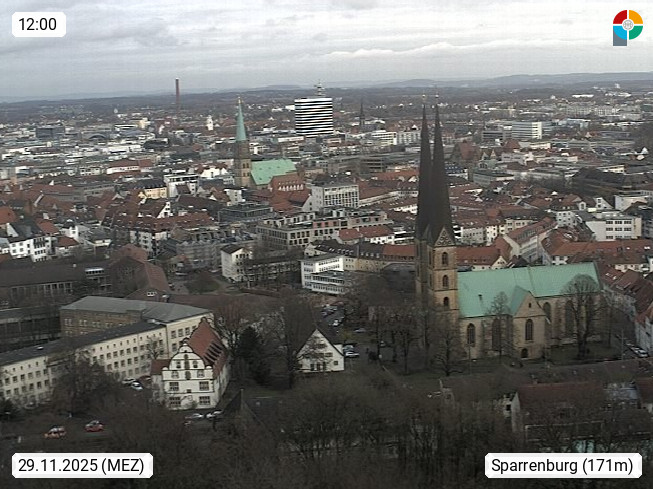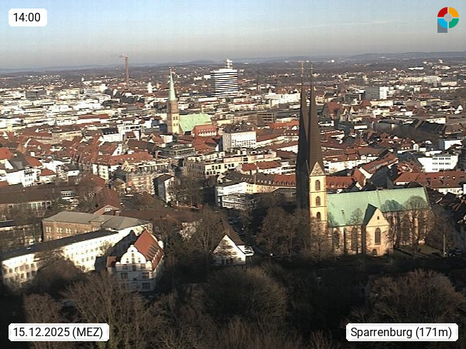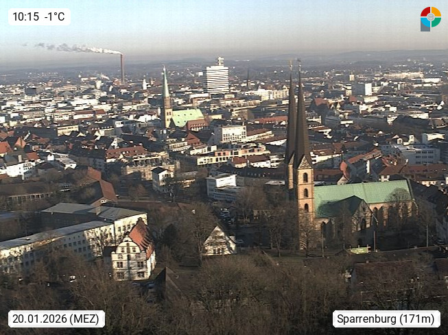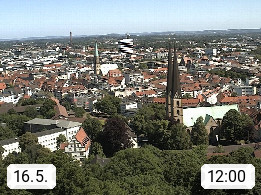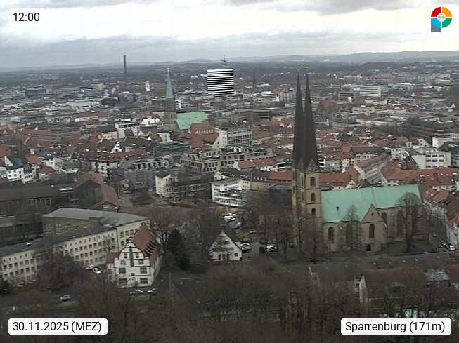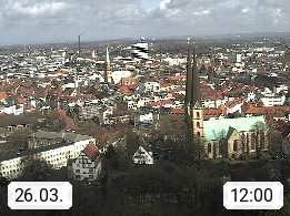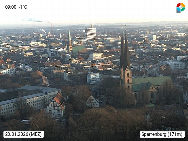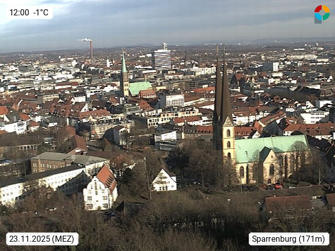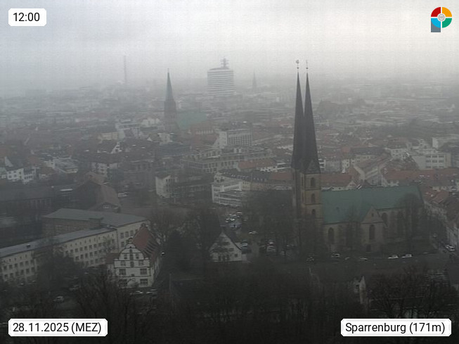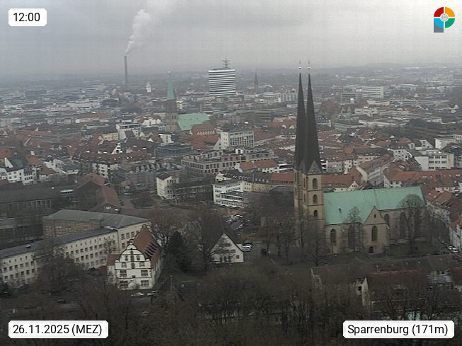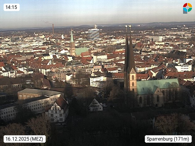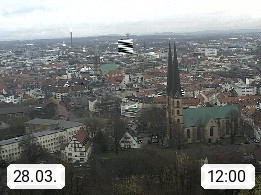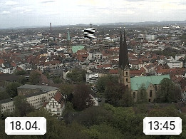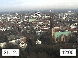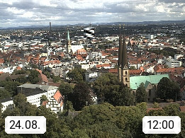 D 33609 Bielfeld Sparrenburg 182m, kreisfreie Stadt im Regierungsbezirk Detmold im Nordosten Nordrhein Westfalens in der Hügellandschaft der Ravensberger Mulde. Panoramablick von der Sparrenburg einer restaurierten Festungsanlage und Wahrzeichen von Bielefeld, Richtung Norden. Präsentiert von https://bicos.de/.