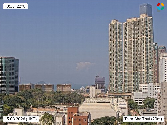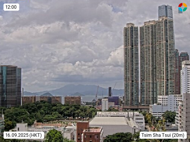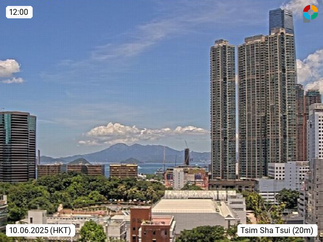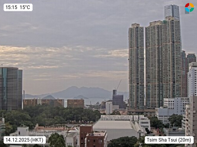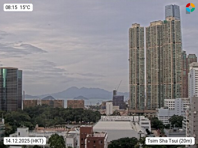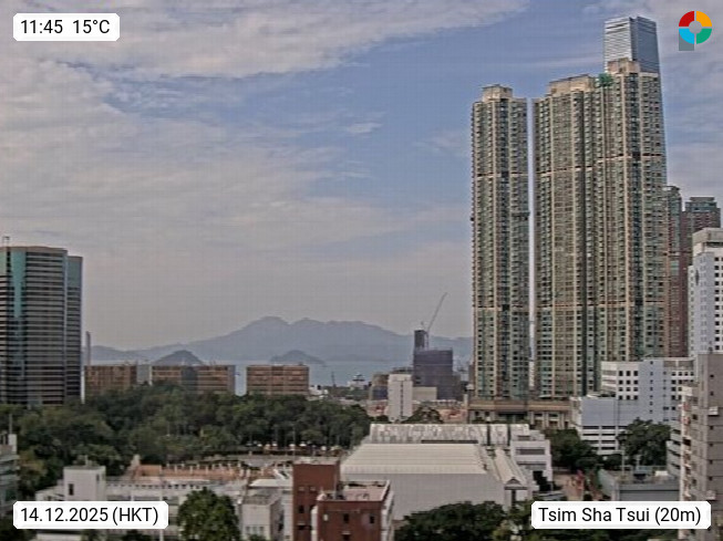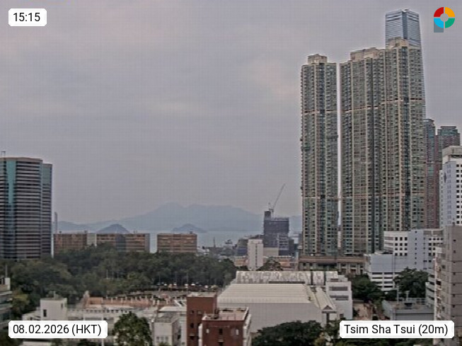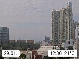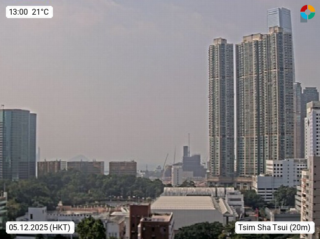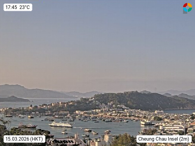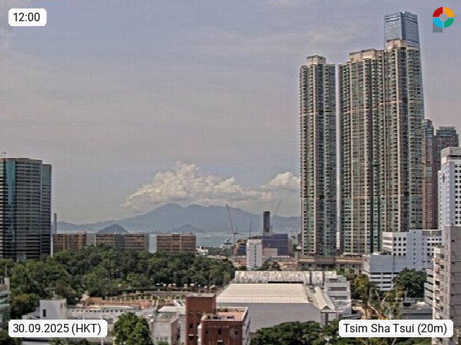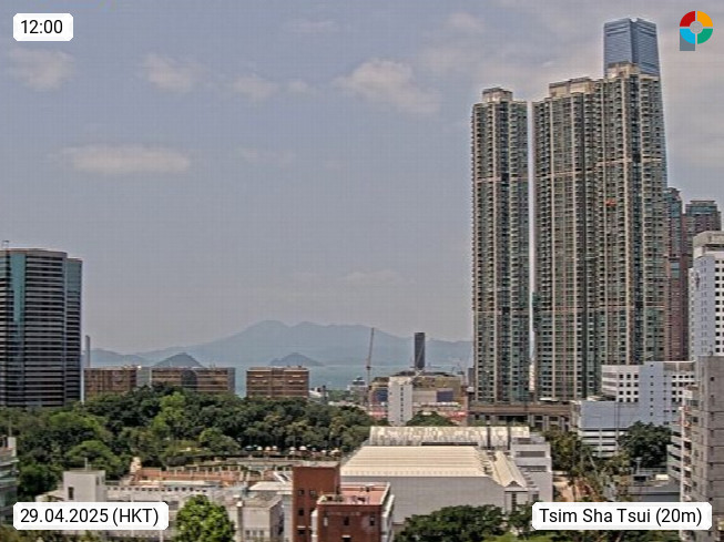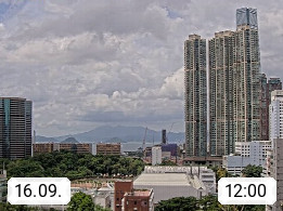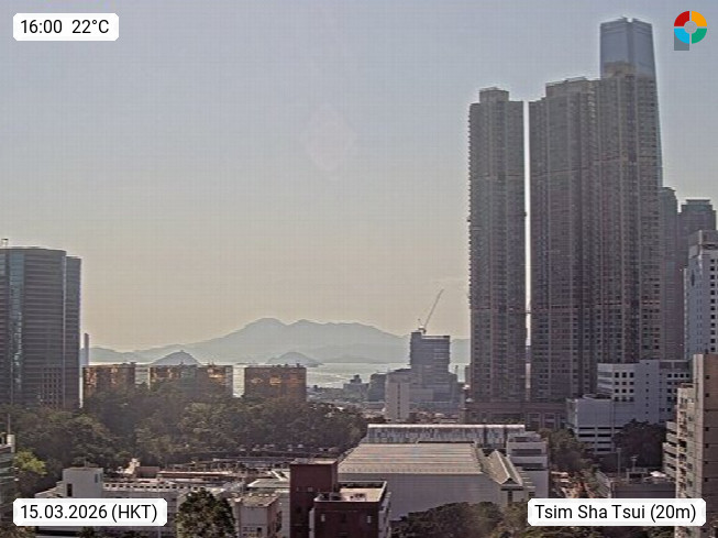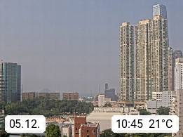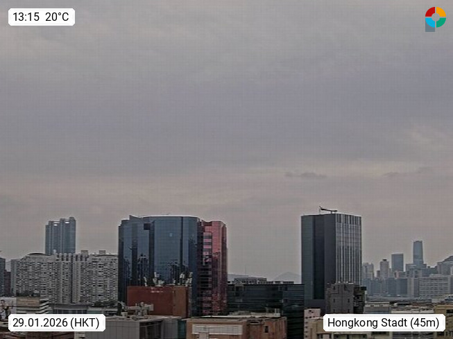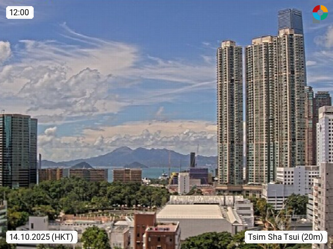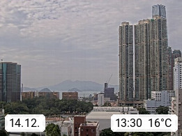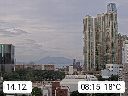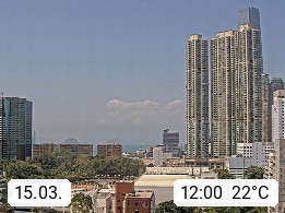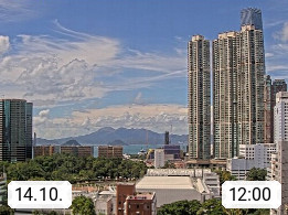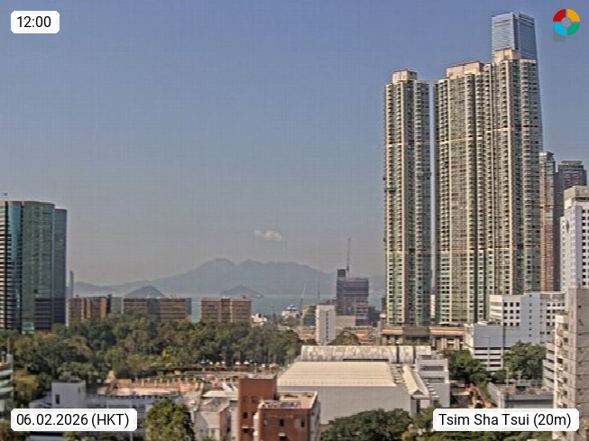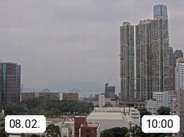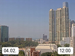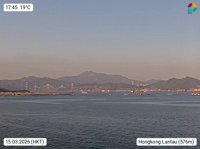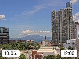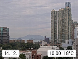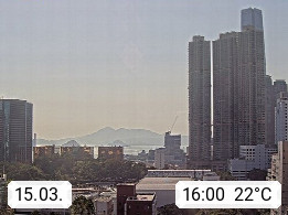 Hongkong 2.755 km² seit 1997 Hong Kong Special Administrative Region of the People Republic of China, eine Sonderverwaltungszone an der Südküste der Volksrepublik China. Hongkong liegt an der Mündung des Perlflusses in das südchinesische Meer und erstreckt sich über eine Halbinsel und rund 260 dazu gehörenden Inseln. Hongkong ist hinsichtlich der Bevölkerungszahl mit rund 7 Mio Einwohnern die drittgrößte Metropolregion der Volksrepublik China. Blick vom Bürogebäude des Wetterdienstes in Honkong Richtung Westen, von links beginnend, Kowloon Park, Green Island, Kau Yi Chau, und im Hintergrund den Sunset Peak. Präsentiert von https://www.hko.gov.hk/.