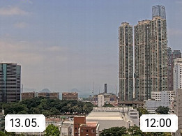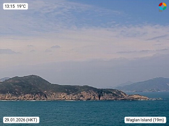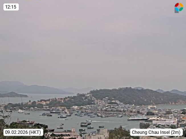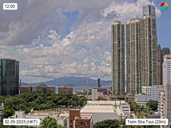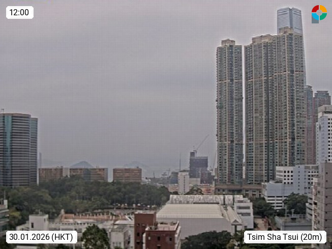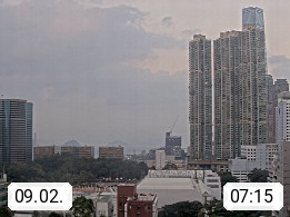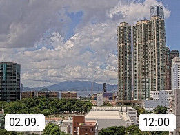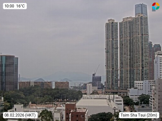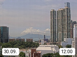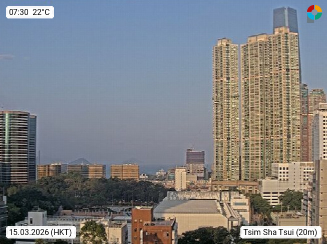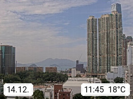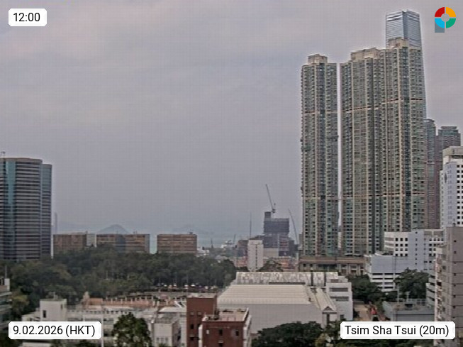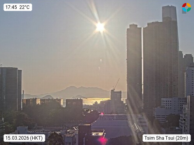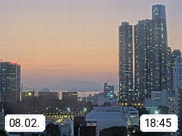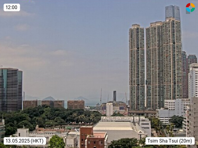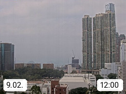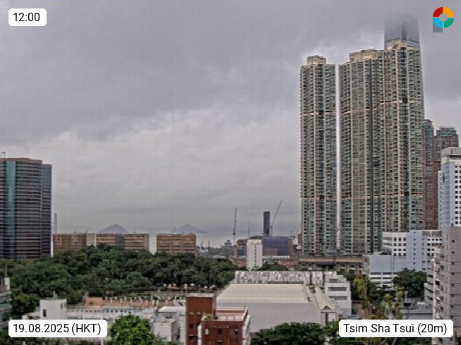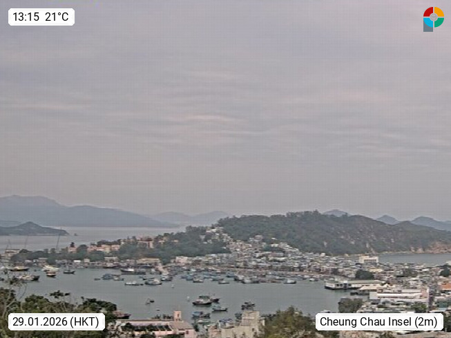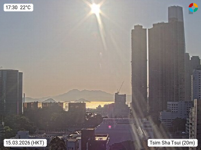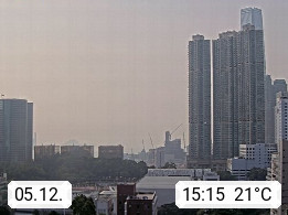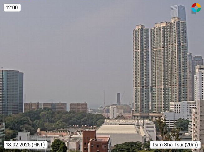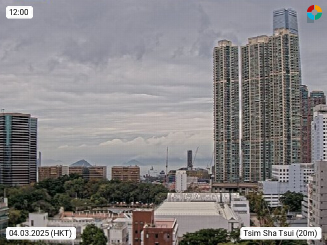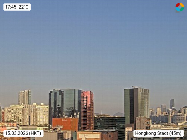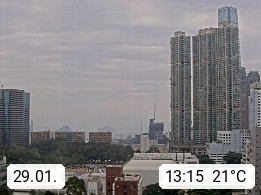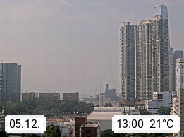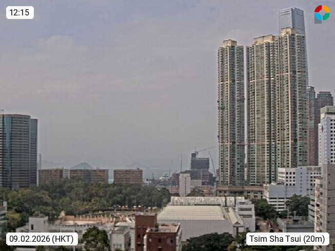 Hongkong 2.755 km² seit 1997 Hong Kong Special Administrative Region of the People Republic of China, eine Sonderverwaltungszone an der Südküste der Volksrepublik China. Hongkong liegt an der Mündung des Perlflusses in das südchinesische Meer und erstreckt sich über eine Halbinsel und rund 260 dazu gehörenden Inseln. Hongkong ist hinsichtlich der Bevölkerungszahl mit rund 7 Mio Einwohnern die drittgrößte Metropolregion der Volksrepublik China. Blick vom Bürogebäude des Wetterdienstes in Honkong Richtung Westen, von links beginnend, Kowloon Park, Green Island, Kau Yi Chau, und im Hintergrund den Sunset Peak. Präsentiert von https://www.hko.gov.hk/.